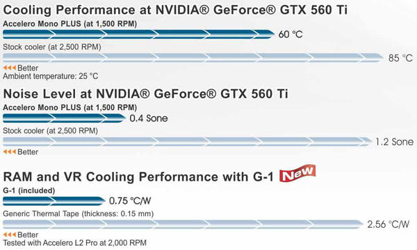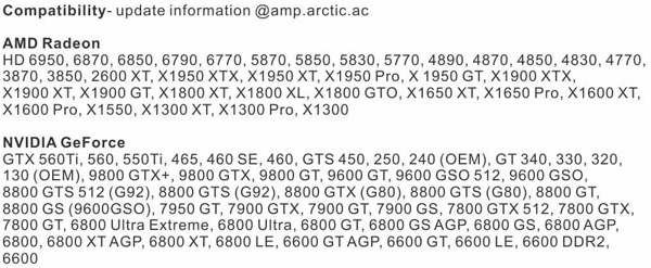 Nella seguente immagine, ARCTIC, mostra le prestazioni, sia termiche che acustiche, del nuovo cooler, paragonandolo al dissipatore reference della NVIDIA GeForce GTX 560 Ti, mentre, nell'ultimo grafico, l'azienda svizzera evidenzia il vantaggio della pasta termica ARCTIC G-1 rispetto ad una tradizionale. Viene pubblicata inoltre la lunga lista delle schede video compatibili con il dissipatore.